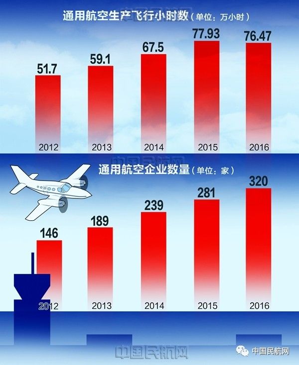 2016年,全行业完成通用航空生产飞行76.47万小时、通用航空企业320家、在册航空器总数达到2096架,较2012年分别增加了47.9%和19.2%。