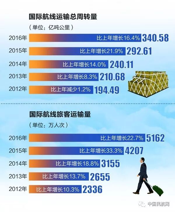 截至2016年底,我国民航国际空运航线运输总周转量比上年增长16.4%,高于国内航线5.2个百分点;国际航线旅客周转量比上年增长25.8%,高于国内航线14.1个百分点。我国与120个国家(地区)签署了双边航空运输协定,国际航线达到739条,比2012年增加358条,增长94%。