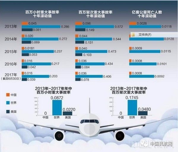 自党的十八大以来,我国民航安全水平大幅提高,全行业未发生运输航空重大安全事故,安全水平世界领先,百万架次重大事故率均低于世界平均水平。2013年~2017年年中,我国民航运输航空百万小时重大事故率为0,同期世界平均水平约为0.0872,其中美国为0.0220;我国民航百万架次重大事故率为0,同期世界平均水平为0.1745,其中美国为0.0480;我国民航亿客公里死亡人数为0,同期世界平均水平为0.0074。