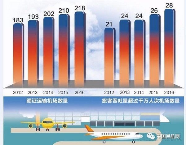 2016年,全国民航运输机场完成旅客吞吐量、货邮吞吐量分别为10.16亿人次、1510.4万吨。其中,28座机场年旅客吞吐量超过1000万人次,比5年前增加7座;年旅客吞吐量超过3000万人次的机场达到10座,比5年前增加5座。北京首都机场完成旅客吞吐量0.94亿人次,连续7年位居世界第二;上海浦东机场完成货邮吞吐量334万吨,连续9年位居世界第三。