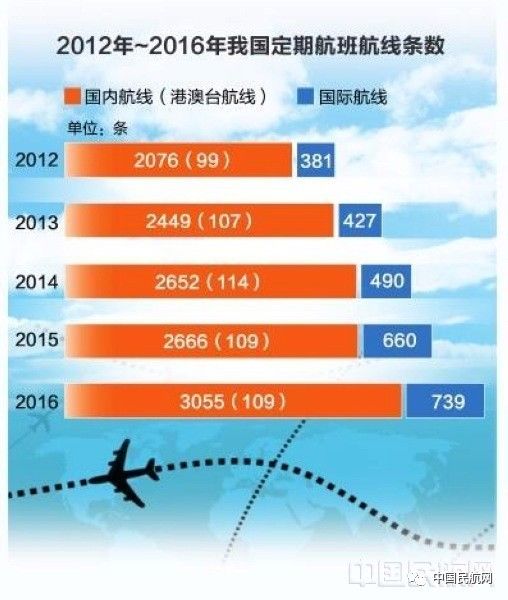 截至2016年底,我国共有定期航班航线3794条,比2012年的2457条增长了54.4%。按不重复距离计算的航线里程为634.8万公里,比2012年增长93.5%。在通航城市方面,2016年底,我国定期航班国内通航城市达到214个(不含香港、澳门、台湾),比2012年底的178个增加了36个。我国航空公司国际定期航班通航56个国家的145个城市,比5年前分别增长了7.7%、19.8%;我国航空公司定期航班从38个内地城市通航香港、从10个内地城市通航澳门,大陆航空公司从48个大陆城市通航台湾地区。