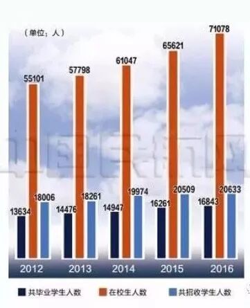 作为人才密集型行业,民航在保障安全、强化监管、提升服务水平等方面都需要专业人才作支撑。2016年,民航直属院校共招收学生20633人,其中,研究生970人,普通本专科生17948人,成人招生1715人;民航直属院校在校生达到71078人,其中,研究生3435人,普通本专科生60598人,成人在校生7045人;民航直属院校共毕业学生16843人,其中,硕士研究生919人,普通本专科14006人,成人学生1918人。