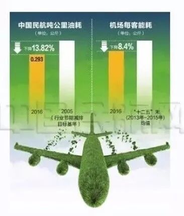 2016年,中国民航吨公里油耗为0.293公斤,较2005年(行业节能减排目标基年)下降13.82%;机场每客能耗较“十二五”末(2013-2015)均值下降8.4%。